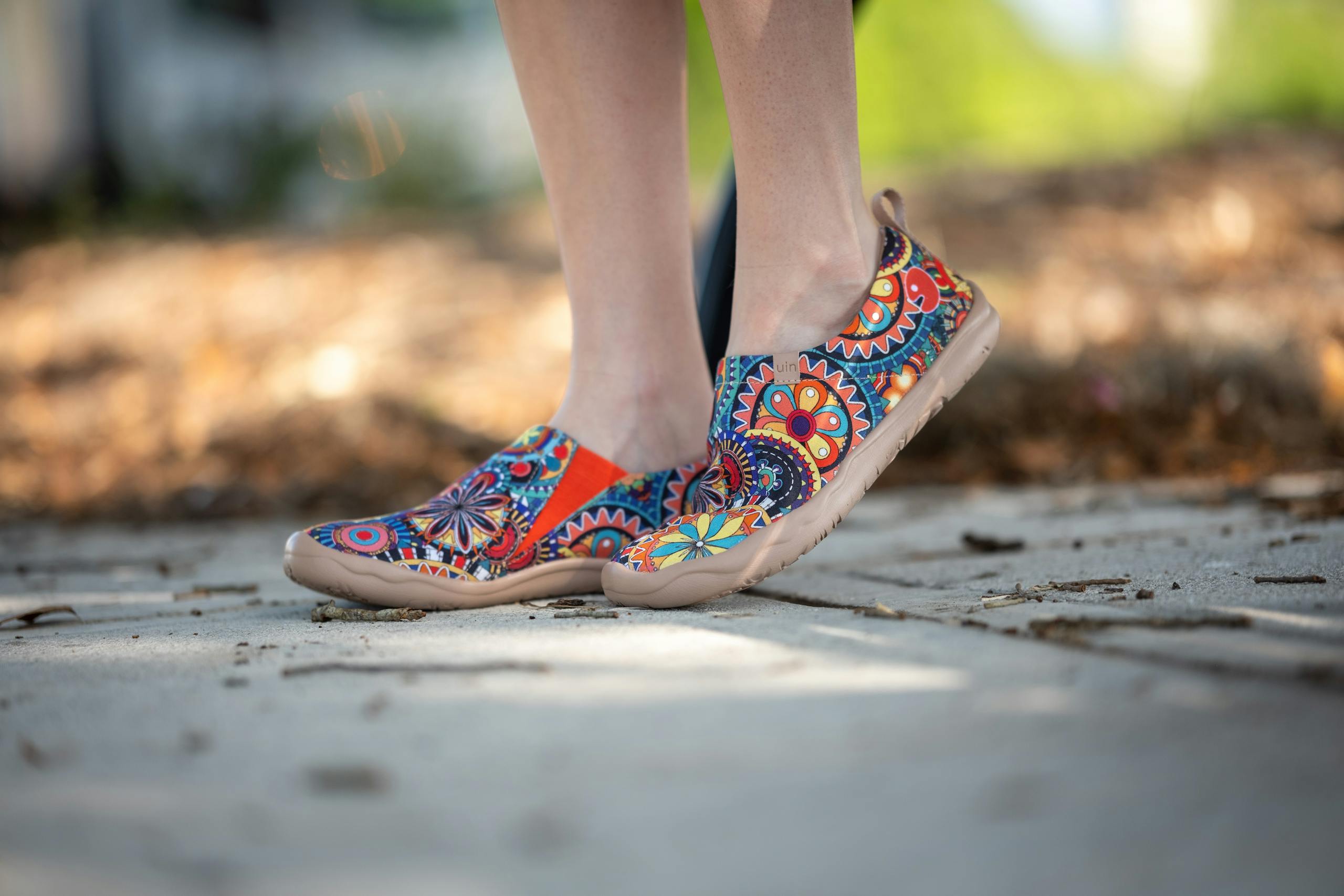 Vibrant casual shoes with colorful patterns worn outdoors on a sunny day.