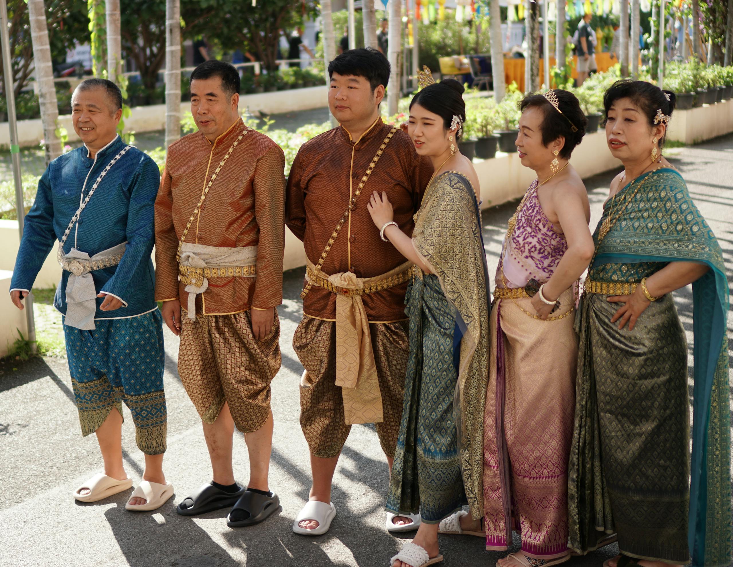 A family dressed in traditional Thai attire posing outdoors at a cultural event in Chiang Mai, Thailand.