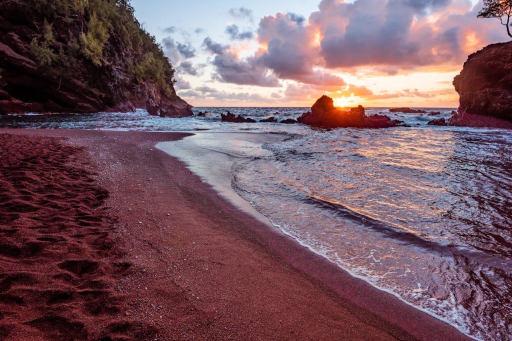 Kaihalulu Beach, or Red Sand Beach, is a remote Maui cove famed for its striking red sand formed from iron rich volcanic rock. The vivid crimson contrasts sharply with the ocean’s deep blue and the surrounding black lava rocks. Protected by rocky cliffs, it features calmer waters than the nearby coast, inviting adventurers to hike through rugged terrain to reach this rare natural retreat. The dramatic colors offer a vibrant shore unlike most in the world.
